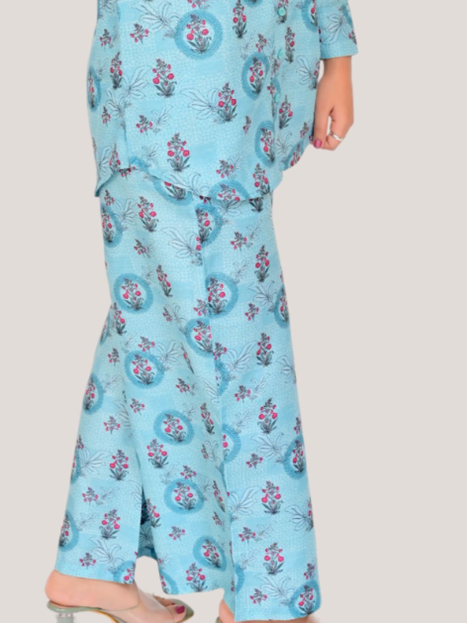 Rooted in tradition, thriving in modernity. 🌿 Embrace the vibrant charm of this light turquoise ethnic print bottom wear , where culture meets contemporary flair. Elevate your style with a touch of heritage.