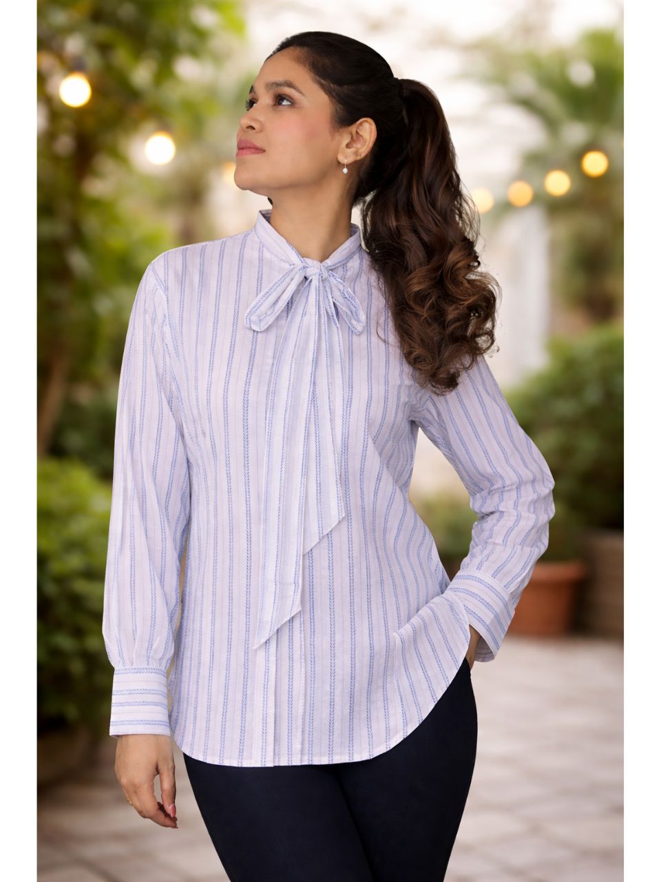 Add a refined charm to your wardrobe with the Rhythm Black and White Bow Cotton Top, crafted in breathable cotton and designed with a delicate herringbone stripe pattern. The graceful bow neckline brings a soft feminine touch, while the structured silhouette keeps the look polished and sophisticated.