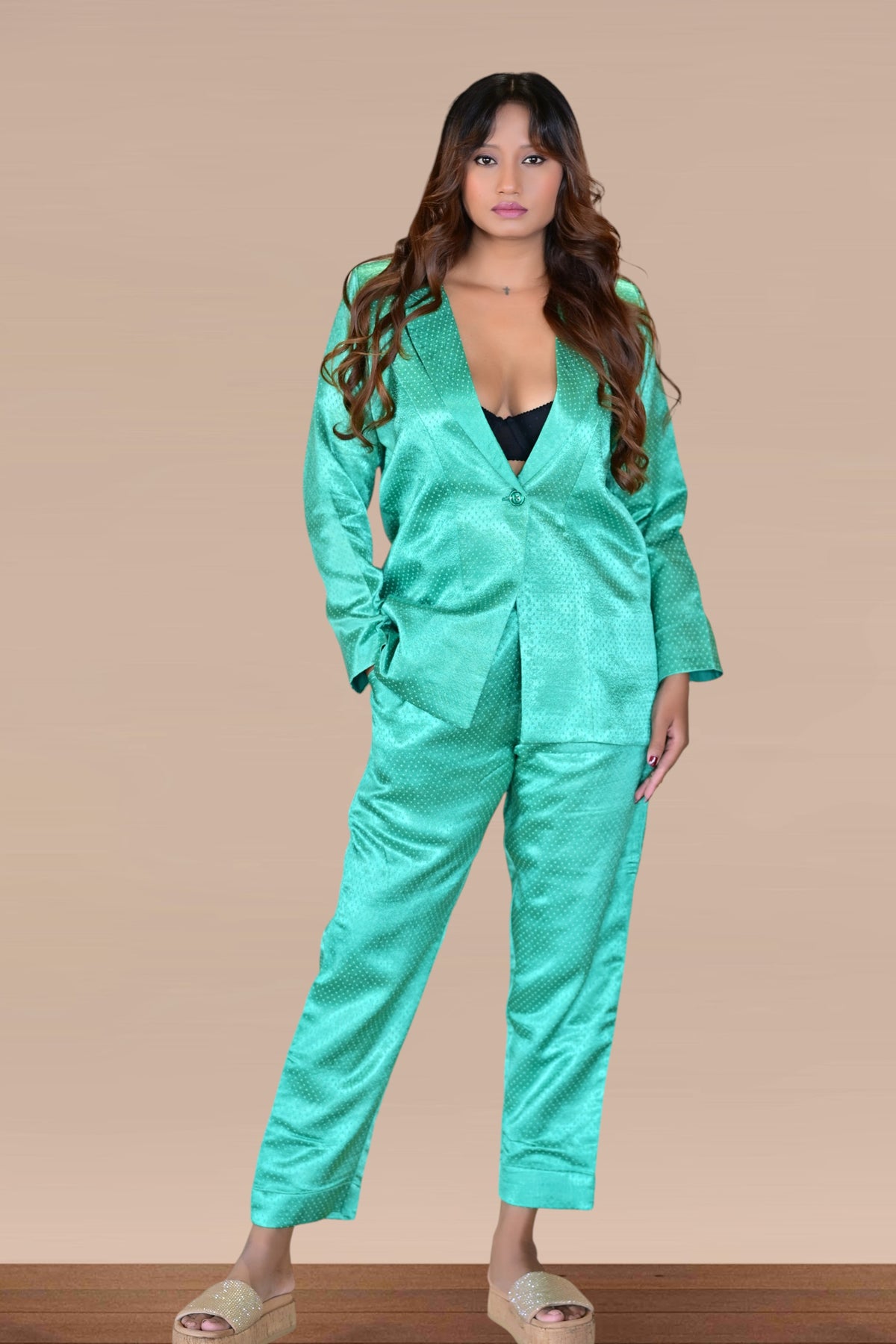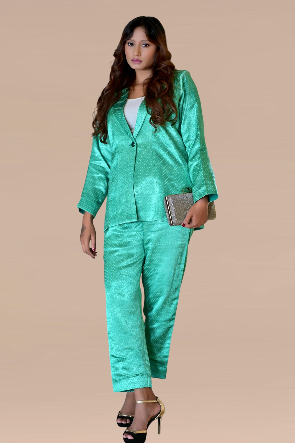 Where grace meets finesse. The Mashru Silk Blazer Set is a modern expression of elegance, crafted in luxurious mashru silk for a gentle sheen and fluid drape. The blouse features refined detailing and a flattering silhouette, paired with coordinated straight pants that flow effortlessly. Whether it’s a festive gathering, an evening soiree, or an elegant brunch, this set embodies timeless sophistication with modern ease.