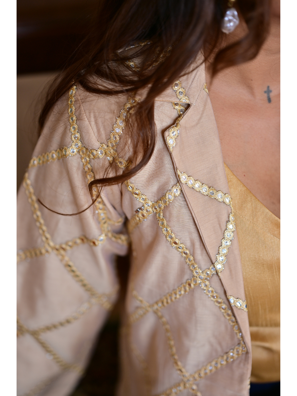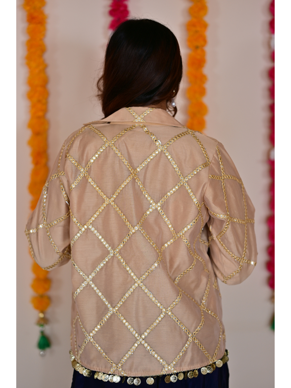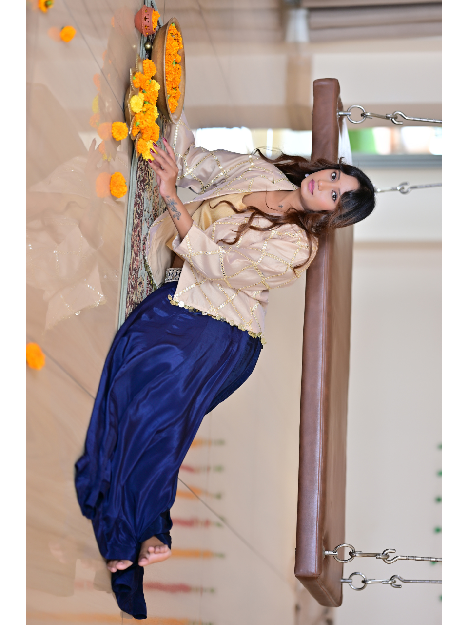 Where subtlety meets splendor. The Beige Blue Midnight Ensemble pairs an intricately embroidered beige Chanderi jacket with a lustrous navy blue silk skirt, creating a perfect balance of softness and depth. The gentle shimmer of Chanderi embroidery enhances the understated beige tone, while the deep blue silk skirt adds regal grace. A statement of refined elegance, this ensemble transitions effortlessly from festive soirées to elegant celebrations.