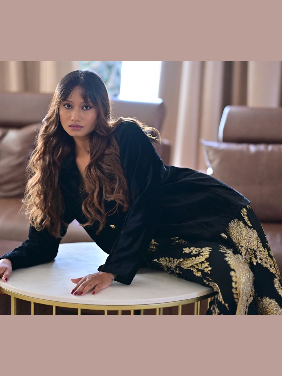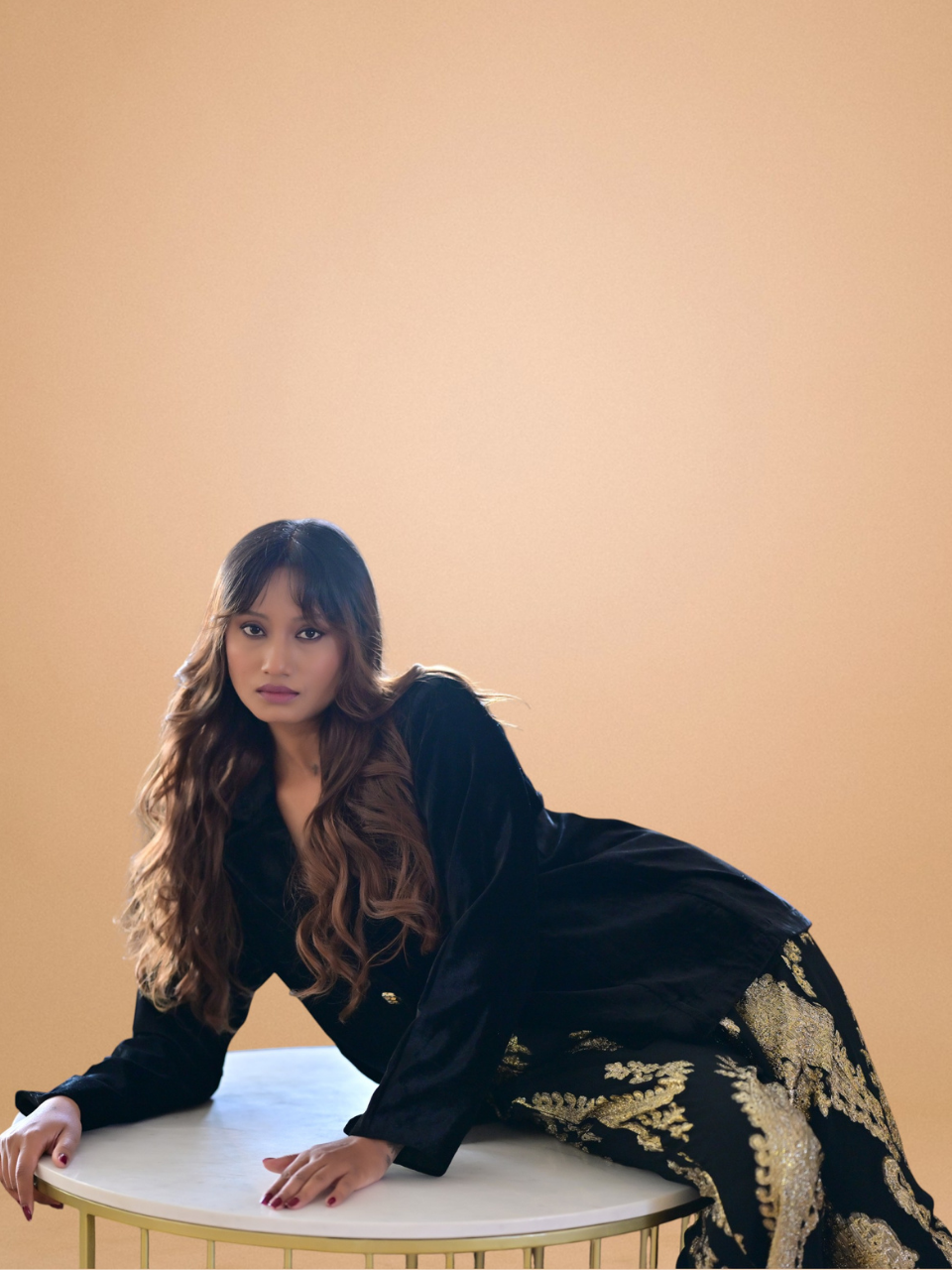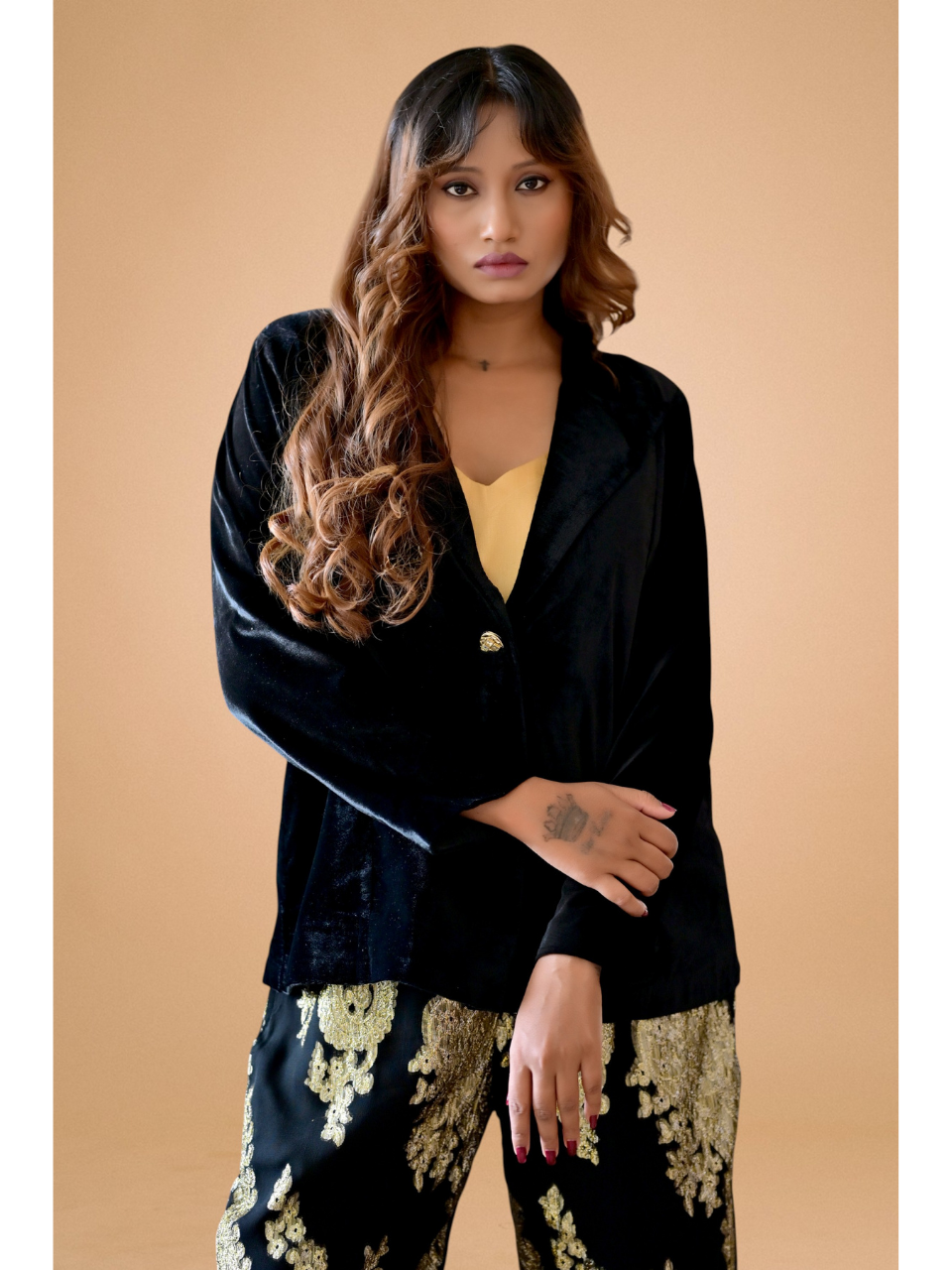 Where luxury meets poise. The Velvet Zari Blazer Set is a statement of refined elegance, crafted in plush velvet adorned with delicate zari accents that catch the light with every move. The tailored blazer features intricate detailing and a structured fit, paired with coordinated trousers for a look that exudes effortless sophistication. Perfect for festive evenings, intimate gatherings, or special celebrations, this set blends classic charm with modern allure.